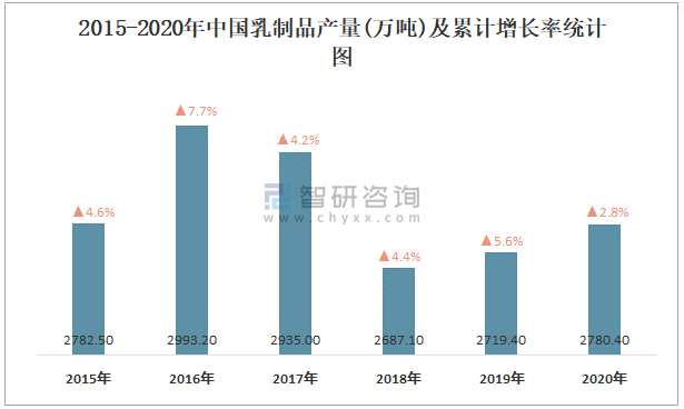 2015-2020年中國乳制品產量及累計增長率統計圖