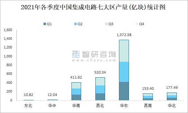 2021年各季度中國集成電路七大區產量統計圖