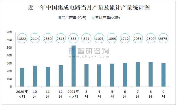 根據國家統計局數據顯示:2021年9月中國集成電路產量為304億塊,同比增長21.4%;2021年1-9月中國集成電路累計產量為2674.8億塊,累計增長43.1%;2015-2020年中國集成電路產量逐年遞增,2020年達到最高。