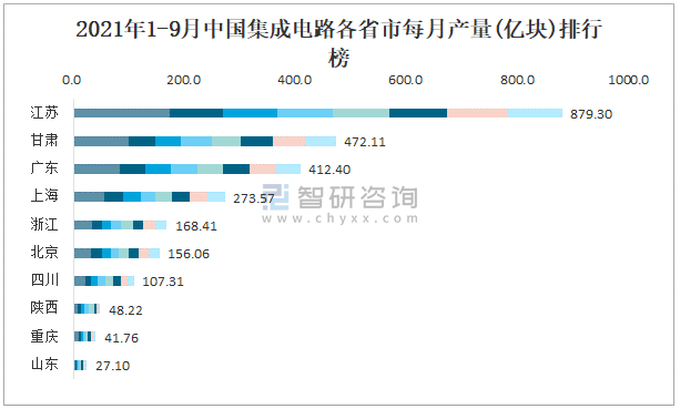 2021年1-9月中國集成電路各省市每月產量排行榜