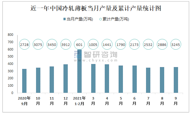 近一年中國冷軋薄板當月產量及累計產量統計圖