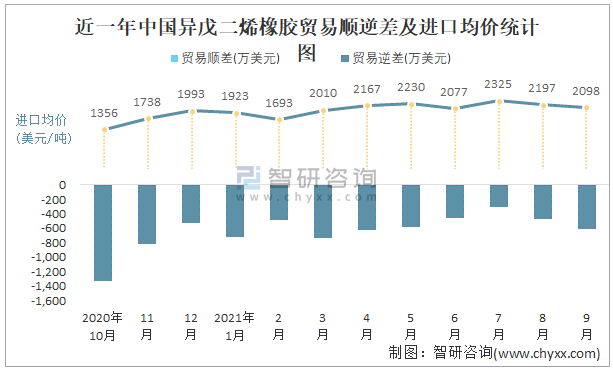 近一年中國異戊二烯橡膠順逆差及進(jìn)口均價(jià)統(tǒng)計(jì)圖