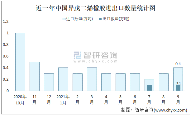 2021年9月中國異戊二烯橡膠進(jìn)出口數(shù)量分別為0.4萬噸和0.1萬噸