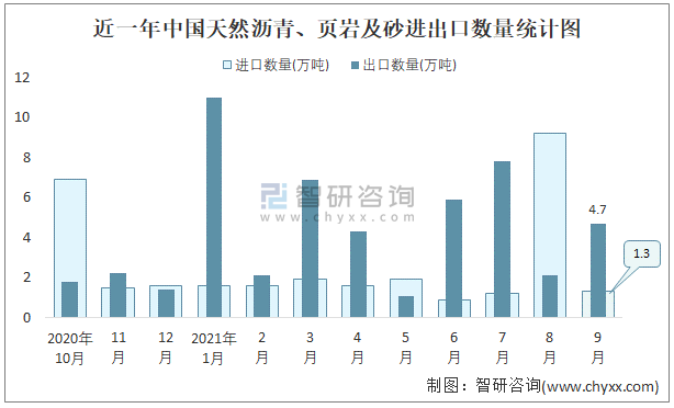 根據(jù)中國石油和化學(xué)工業(yè)聯(lián)合會數(shù)據(jù)顯示:2021年9月中國天然瀝青、頁巖及砂進(jìn)口數(shù)量為1.3萬噸,出口數(shù)量為4.7萬噸;進(jìn)口金額為1110萬美元,出口金額為4391萬美元;近一年中國天然瀝青、頁巖及砂出口總金額大于進(jìn)口總金額,貿(mào)易順差為主,出口均價934美元/噸。