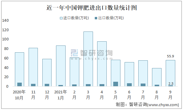 近一年中國鉀肥進出口數量統(tǒng)計圖