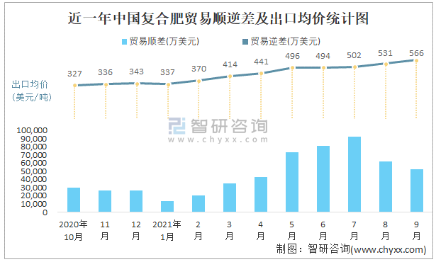 根據中國石油和化學工業聯合會數據顯示:2021年9月中國復合肥進口數量為8.7萬噸,出口數量為103萬噸;進口金額為5611萬美元,出口金額為58305萬美元;近一年中國復合肥出口總金額大于進口總金額,貿易順差為主,出口均價566美元/噸。