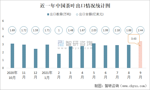 2021年9月中國茶葉出口數量和出口金額分別為3.43萬噸和2.44億美元