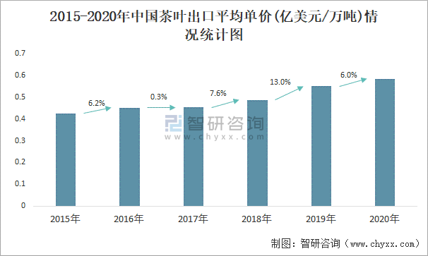 根據中國海關數據顯示:2015-2020年中國茶葉出口數量2019年達到最大值,此后有所下滑,出口金額逐年遞增;2015-2020年中國茶葉出口平均單價逐年遞增,2019年增長速度最快,并達到最大值。
