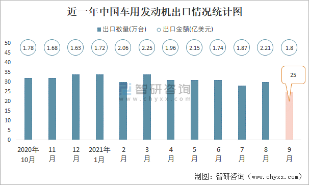近一年中國(guó)車用發(fā)動(dòng)機(jī)出口情況統(tǒng)計(jì)圖