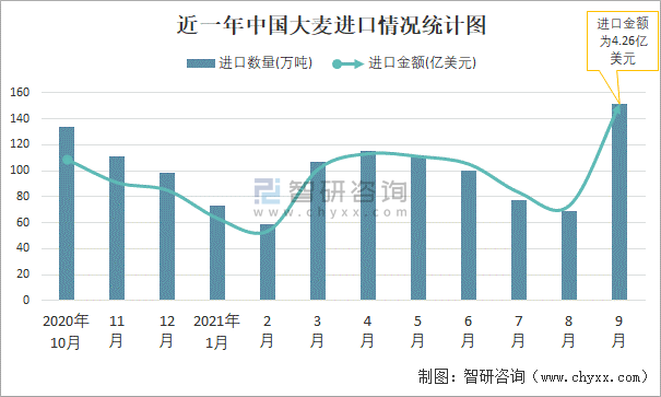 根據中國海關數據顯示:2021年9月中國大麥進口數量為151萬噸,同比增長12.1%,進口金額為4.26億美元,同比增長45.3%,2021年1-9月中國大麥進口數量為861萬噸,進口金額為24.06億美元。