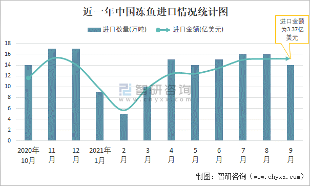 根據中國海關數據顯示:2021年9月中國凍魚進口數量為14萬噸,同比下降18%,進口金額為3.37億美元,同比增長6.2%,2021年1-9月中國凍魚進口數量為115萬噸,進口金額為24.07億美元。
