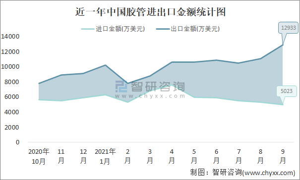 根據中國石油和化學工業聯合會數據顯示:2021年9月中國膠管進口數量為0.3萬噸,出口數量為2.6萬噸;進口金額為5023萬美元,出口金額為12933萬美元;近一年中國膠管出口總金額大于進口總金額,貿易順差為主,出口均價4974美元/噸。