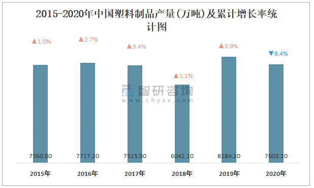 2015-2020年中國塑料制品產量及累計增長率統計圖