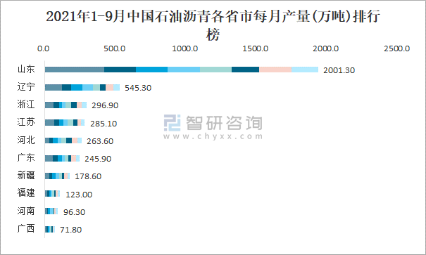 2021年1-9月中國石油瀝青各省市每月產量排行榜