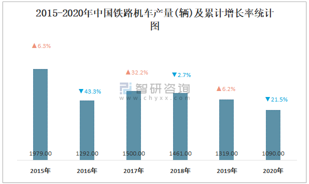 2015-2020年中國鐵路機車產量及累計增長率統計圖