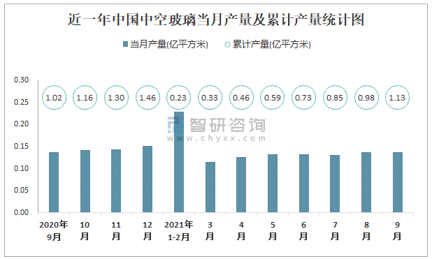近一年中國中空玻璃當月產量及累計產量統計圖