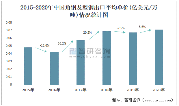 根據中國海關數據顯示:2015-2020年中國角鋼及型鋼出口數量逐年遞減,出口金額總體呈下降趨勢;2015-2020年中國角鋼及型鋼出口平均單價2017年增長速度最快,而2016年中國角鋼及型鋼出口平均單價下降速度最快,下滑了12.6%,跌至最低值。