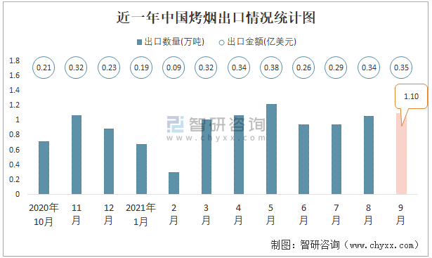 根據中國海關數據顯示:2021年9月中國烤煙出口數量為1.1萬噸,同比增長20.8%,出口金額為0.35億美元,同比增長41.5%;2021年1-9月中國烤煙出口數量為8.34萬噸,出口金額為2.56億美元。