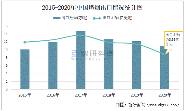 2015-2020年中國烤煙出口情況統計圖