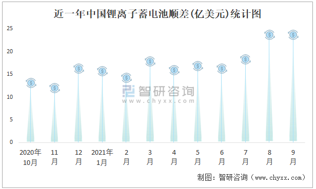 根據中國海關數據顯示:近一年中國鋰離子蓄電池進口金額總體小于出口金額,進出口貿易全部為順差,順差規模在8月達到最大,9月有小幅度縮減。