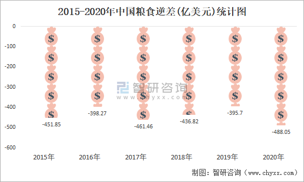 2015-2020年中國糧食逆差(億美元)統計圖