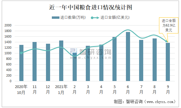 近一年中國糧食進口情況統計圖