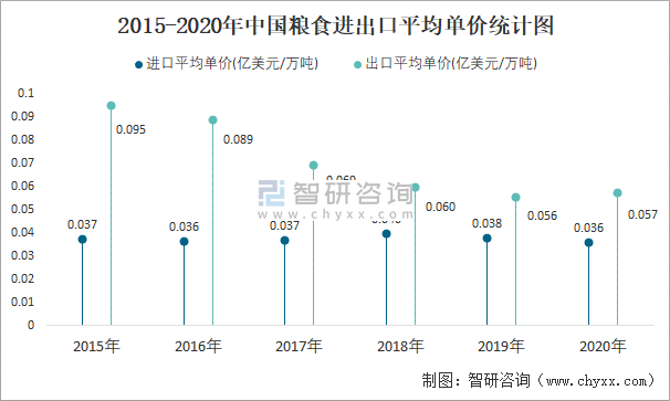 2015-2020年中國糧食進出口平均單價統計圖
