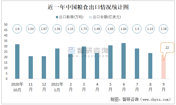 近一年中國糧食出口情況統計圖