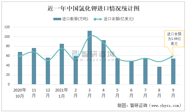 2021年9月中國氯化鉀進(jìn)口數(shù)量和進(jìn)口金額分別為54萬噸和1.49億美元