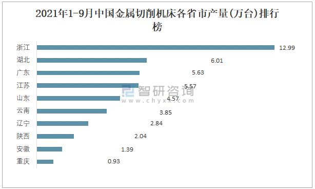 根據國家統計局數據顯示:2021年各季度中國金屬切削機床主要集中在華東、華中、華南地區生產;2021年1-9月中國金屬切削機床產量大區分布不均衡,其中華東地區產量最高,特別是浙江省貢獻了最多產量;2021年1-9月中國金屬切削機床各省市產量top1遙遙領先于其他前9名。