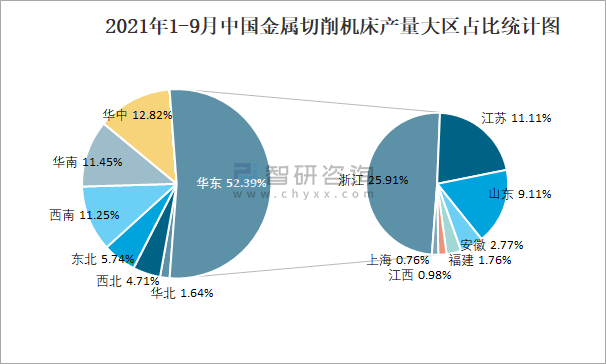 2021年1-9月中國金屬切削機床產量大區占比統計圖