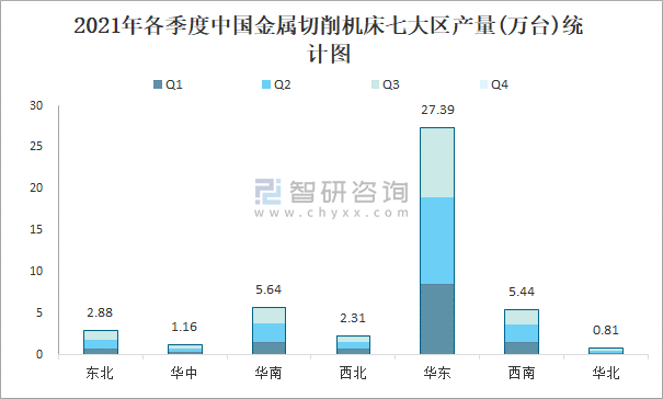 2021年各季度中國金屬切削機床七大區產量統計圖