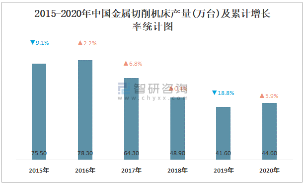 2015-2020年中國金屬切削機床產量及累計增長率統計圖