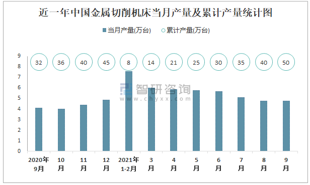 近一年中國金屬切削機床當月產量及累計產量統計圖