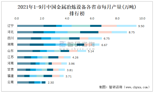 2021年1-9月中國金屬冶煉設(shè)備各省市每月產(chǎn)量排行榜