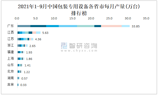 2021年1-9月中國包裝專用設備各省市每月產量排行榜