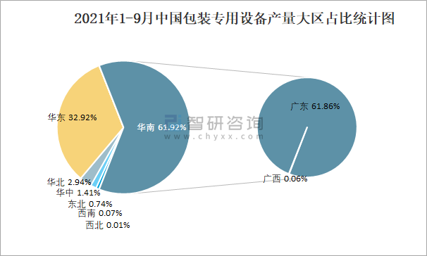 2021年1-9月中國包裝專用設備產量大區占比統計圖