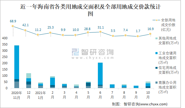 近一年海南省各類用地成交面積及全部用地成交價款統(tǒng)計圖