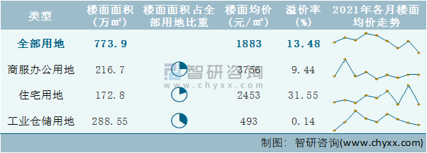 根據(jù)國信房地產(chǎn)信息網(wǎng)數(shù)據(jù)統(tǒng)計可知:2021年10月海南省全部用地出讓地面均價為3606元/㎡,其中商服辦公用地出讓地面均價最高(12598元/㎡),全部用地成交地面均價為3091元/㎡,其中住宅用地成交地面均價為3469元/㎡,低于商服辦公用地成交地面均價;2021年1-10月海南省工業(yè)倉儲用地樓面面積占其全部用地比重最多,為37.29%,溢價率為0.14%。