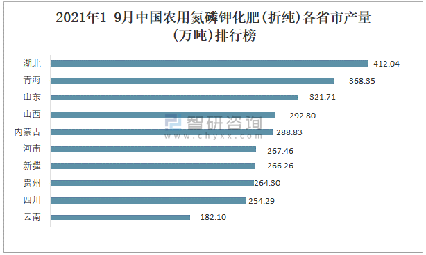 2021年1-9月中國農用氮磷鉀化肥(折純)各省市產量排行榜