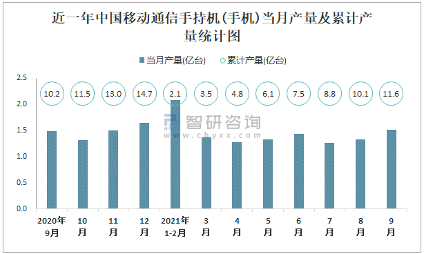 根據(jù)國家統(tǒng)計(jì)局?jǐn)?shù)據(jù)顯示:2021年9月中國移動(dòng)通信手持機(jī)(手機(jī))產(chǎn)量為1.5億臺(tái),同比下降5.2%;2021年1-9月中國移動(dòng)通信手持機(jī)(手機(jī))累計(jì)產(chǎn)量為11.6億臺(tái),累計(jì)增長(zhǎng)7.6%;2015-2020年中國移動(dòng)通信手持機(jī)(手機(jī))產(chǎn)量2016年達(dá)到最高,此后逐年遞減。