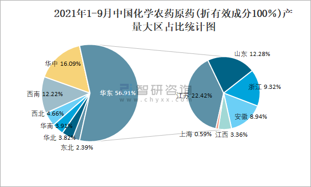 2021年1-9月中國化學農藥原藥(折有效成分100%)產量大區占比統計圖