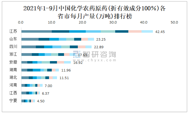 2021年1-9月中國化學農藥原藥(折有效成分100%)各省市每月產量排行榜