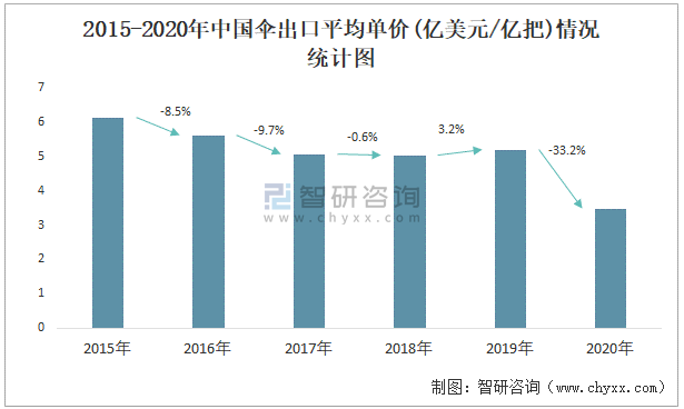 根據(jù)中國(guó)海關(guān)數(shù)據(jù)顯示:2015-2020年中國(guó)傘出口數(shù)量總體呈上升趨勢(shì),出口金額總體呈下降趨勢(shì);2015-2020年中國(guó)傘出口平均單價(jià)2019年增長(zhǎng)速度最快,而2020年中國(guó)傘出口平均單價(jià)下降速度最快,下滑了33.2%,跌至最低值。