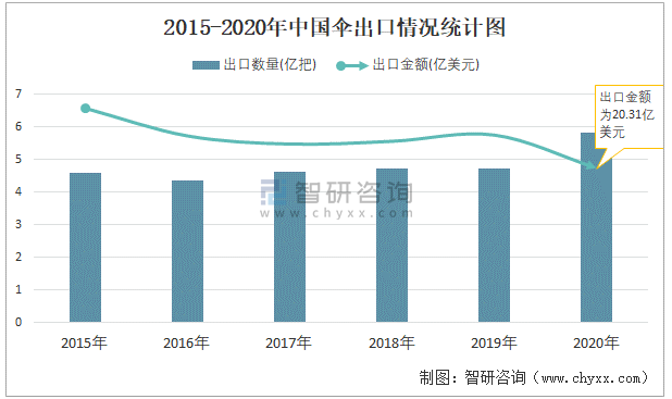2015-2020年中國(guó)傘出口情況統(tǒng)計(jì)圖