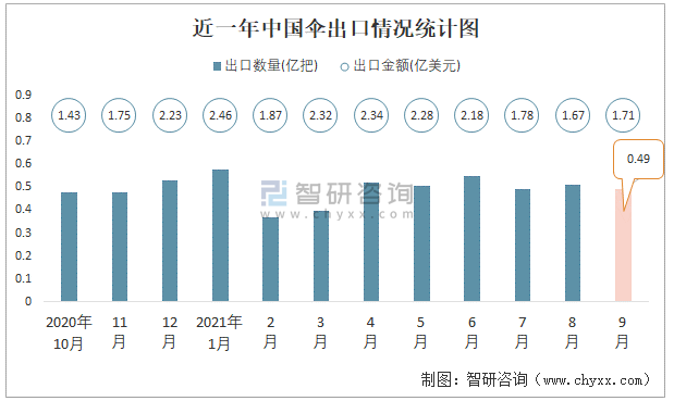 根據(jù)中國(guó)海關(guān)數(shù)據(jù)顯示:2021年9月中國(guó)傘出口數(shù)量為0.49億把,同比下降4.6%,出口金額為1.71億美元,同比增長(zhǎng)25%;2021年1-9月中國(guó)傘出口數(shù)量為4.41億把,出口金額為18.57億美元。