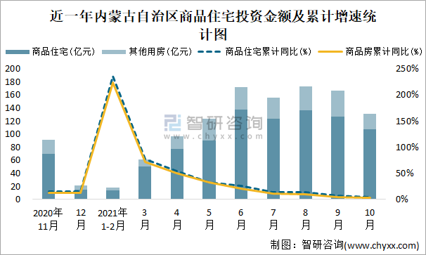 根據國家統計局數據統計可知:2021年10月內蒙古自治區房地產開發投資商品房投資金額為131.19億元(其中商品住宅為107.3億元,辦公樓、商業營業用房等其他用房23.89億元);2021年1-10月內蒙古自治區房地產開發投資商品住宅累計投資金額為863.7億元,投資金額累計同比增長5.1%。