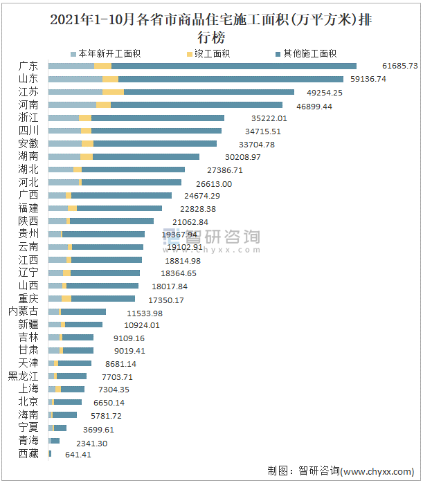 2021年1-10月各省市商品住宅施工面積(萬平方米)排行榜