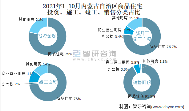2021年1-10月內蒙古自治區商品住宅投資、施工、竣工、銷售分類占比