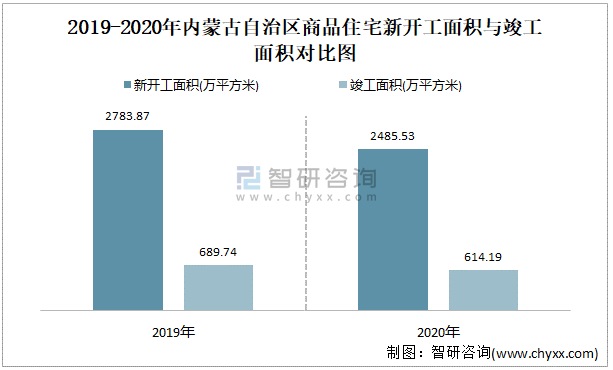 2019-2020年內蒙古自治區商品住宅新開工面積與竣工面積對比圖